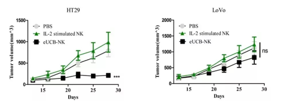 经过检查发现,原来,HT29肿瘤内有大量的NK细胞,而未见于LoVo肿瘤,这可能是两者对eUCB-NK细胞反应出现差异的原因。也就是说,如果NK细胞浸润不足可能会导致NK细胞治疗无效。