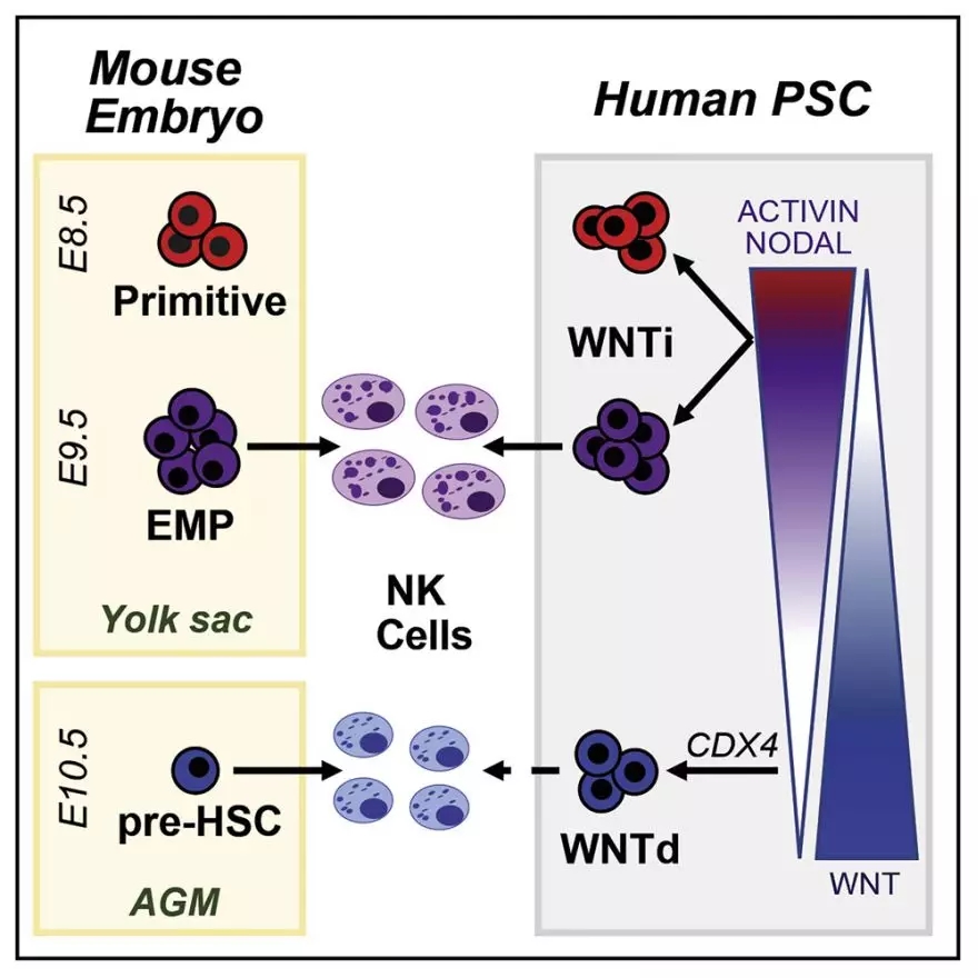 研究人员发现,与大多数研究治疗中使用的“成人版”NK细胞不同,更早期的NK细胞并不来源于骨髓。相反,这些NK细胞是一种特殊的短期免疫细胞,形成于哺乳动物早期胚胎的卵黄囊。