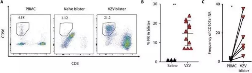 Paust的团队招募了年龄40-60岁之间在孩童时期患有水痘的成年人,并给他们注射了水痘病毒的糖蛋白。在注射部位,水痘患者的皮肤会产生类似水泡的反应,研究人员将水疱内召集来的NK细胞分离出来,经过分析显示,这些NK细胞相当活跃,并与抗原激烈战斗,显然这些细胞的适应性记忆已经持续了几十年。