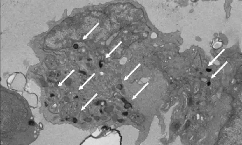 图为研究人员在实验室从人类多能干细胞中培育出的自然杀伤(NK)细胞,这种NK细胞作为癌症免疫疗法可能比来自骨髓的成人NK细胞更有效。白色箭头指的是含有有效抗癌酶的颗粒(成人NK细胞中的这些颗粒相对较少)。
