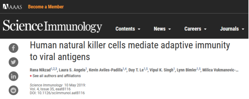不仅如此,其实在先天免疫机制中,NK细胞不仅起效迅速,而且从出生开始就自带“记忆”功能。斯克里普斯研究所的免疫学家Silke Paust就曾在《Science Immunology》杂志上发表报告证实,NK细胞能在人体中形成接触抗原“记忆”的功能。