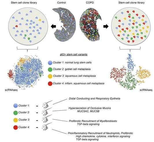 Xian和McKeon发现与正常肺部不同的是,COPD患者的肺部(下称COPD肺部)被三种不寻常的变异肺干细胞占据,这些变异肺干细胞导致已知存在于COPD肺部的化生性病变(metaplastic lesion),但是它们被许多人认为是COPD的次要影响,与COPD的病理没有因果关系。在论文共同第一作者、休斯顿大学干细胞中心博士后研究员Wei Rao将每种变异肺干细胞克隆移植到免疫缺陷受试者体内后,他们发现它们不仅产生明显的COPD化生性病变,而且它们还分别引发了COPD的三重病变,即粘液分泌过多、纤维化和慢性炎症。