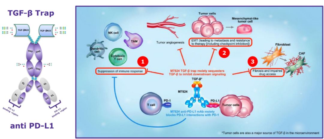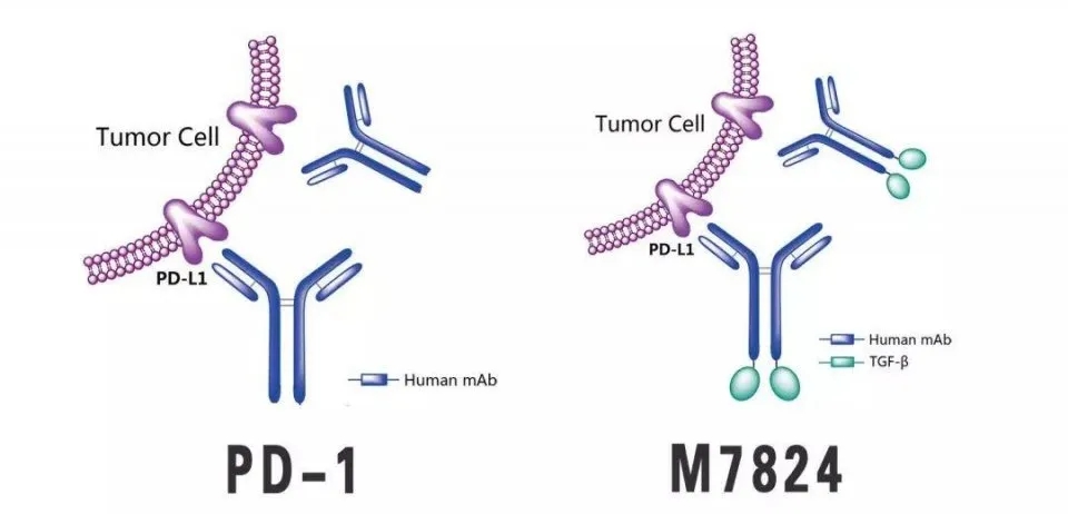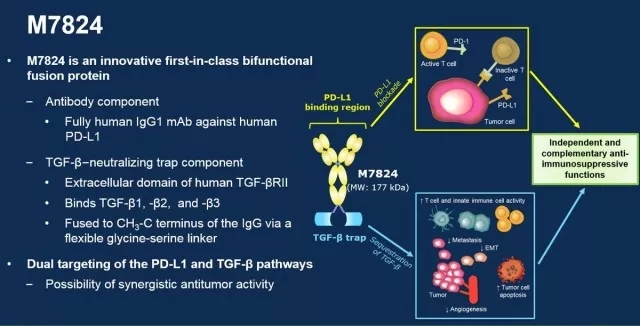 M7824是由人IgG 1组成的双功能蛋白抗PD-L1抗体通过接头与两个TGF-β受体II分子融合