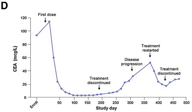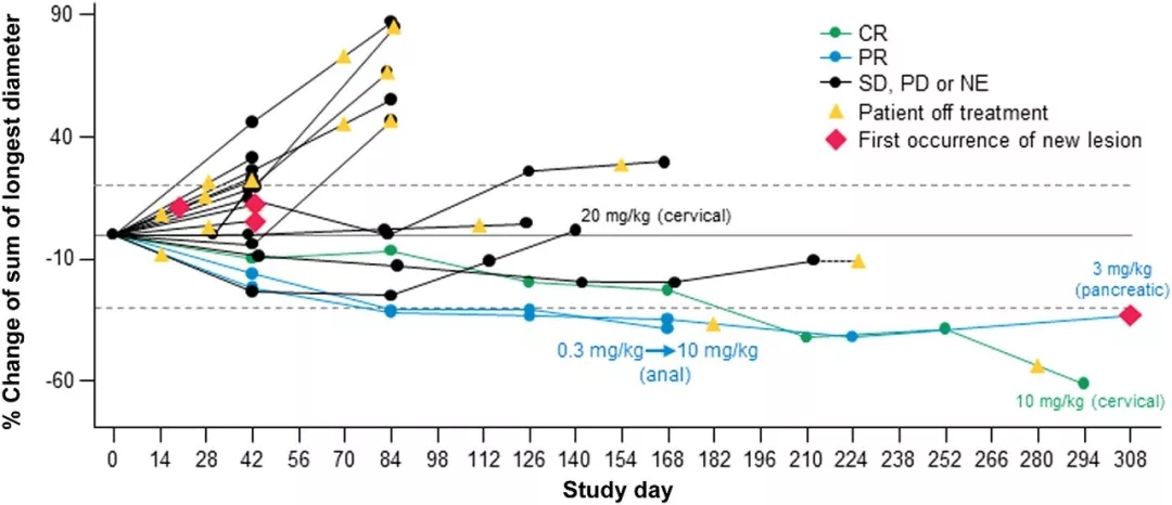 包括一例完全缓解的宫颈癌,两个持久的持久缓解的胰腺癌和肛门癌,一例部分缓解宫颈癌,两例病情稳定(胰腺癌;类癌),以及先前进展的晚期肿瘤治疗后出现缩小的病例(脊索瘤)。有趣的是,完全缓解的子宫颈癌和部分缓解的肛门癌均为HPV阳性,而部分缓解的胰腺癌患者存在错配修复缺陷。