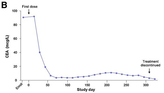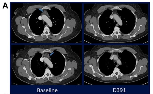 49岁HPV感染阳性的女性转移性宫颈癌患者,在接受顺铂/紫杉醇后加贝伐单抗治疗,随后病情进展,出现两个病理性扩大的纵隔淋巴结(图左侧箭头)。入组M7824的临床试验后,在用药7.5个月后奇迹出现,CT扫描显示达到完全缓解,在13个月的再次扫描仍未发现病灶,证明反应是持久的(图的右侧)。CEA持续下降!