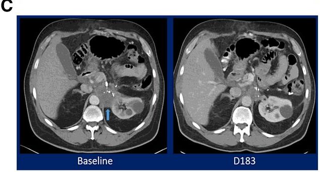 这位61岁的男性患有局部晚期错配修复缺陷型胰腺癌的患者,化疗后入组M7824的临床试验,治疗3个月的CT扫描显示部分缓解,4.5个月时仍显示部分缓解(30%),半年后CT扫描显示病灶竟缩小49%!CEA持续下降!