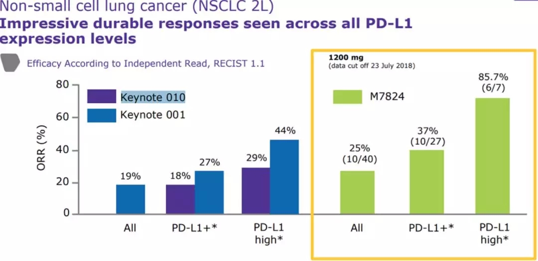 这张图也很清晰的展示了派姆单抗两项研究中的有效率(左)和M7824的对比。
