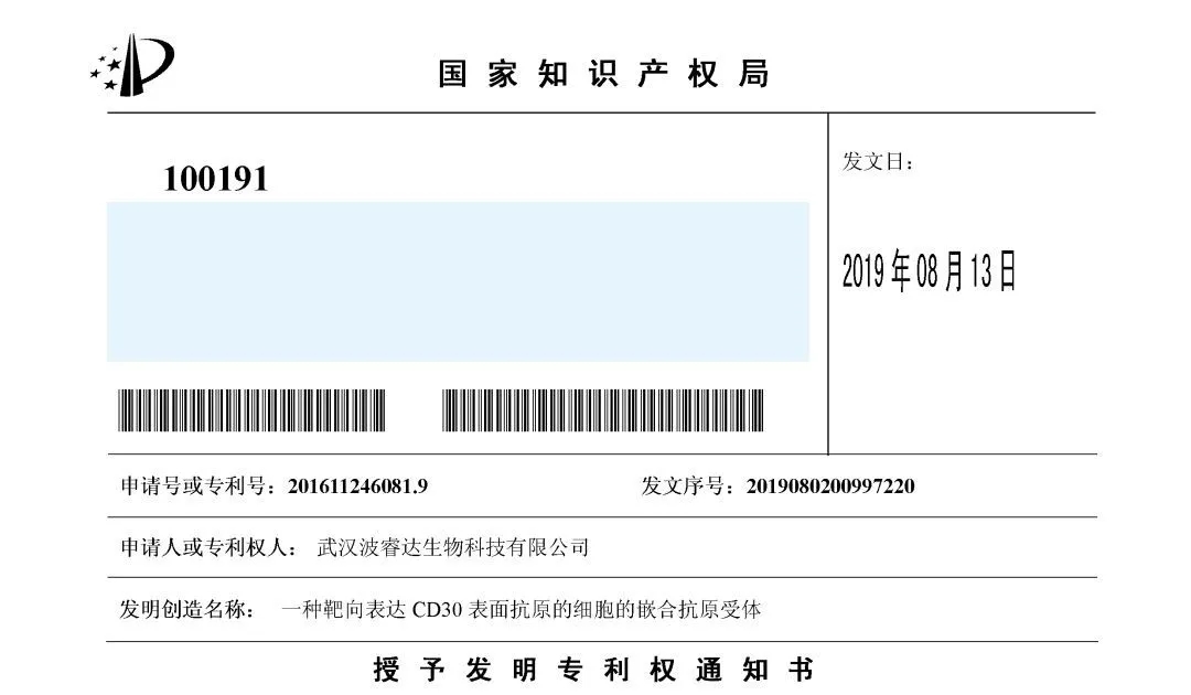 2019年8月,武汉波睿达生物科技有限公司收到国家知识产权局一项发明专利授予专利权的通知:《一种靶向表达CD30表面抗原的细胞的嵌合抗原受体(专利号:201611246081.9)》被授予专利权。