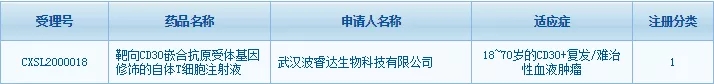 4月21日,武汉波睿达生物科技有限公司自主研发的BRD-01产品—靶向CD30嵌合抗原受体基因修饰的自体T细胞注射液获得国家药品监督管理局(NMPA)药品审评中心(CDE)的临床试验默示许可,即将开展临床试验。该产品是中国被受理的第一个以CD30为靶点的CAR-T细胞治疗产品。