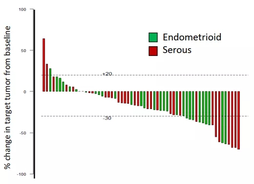 36名子宫内膜样腺癌的患者,有效率为14%,3个月无疾病进展率为67%,中位无疾病进展生存时间为4.8个月;