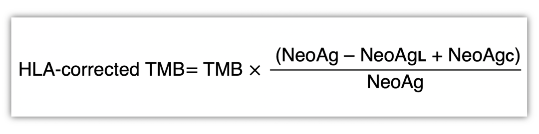 最近,研究发现造成免疫逃逸的抗原呈递通路中的基因改变可能可以作为潜在的生物标志物预测ICIs的疗效。该研究使用WES方法对198位晚期非小细胞肺癌患者免疫治疗前(anti-PD-1或anti-PD-L1单药治疗)的肿瘤样本进行了测序,开发了一种新的算法用于表征肿瘤抗原呈递的改变与免疫治疗疗效的相关性,即HLA校正的TMB。该算法如下: