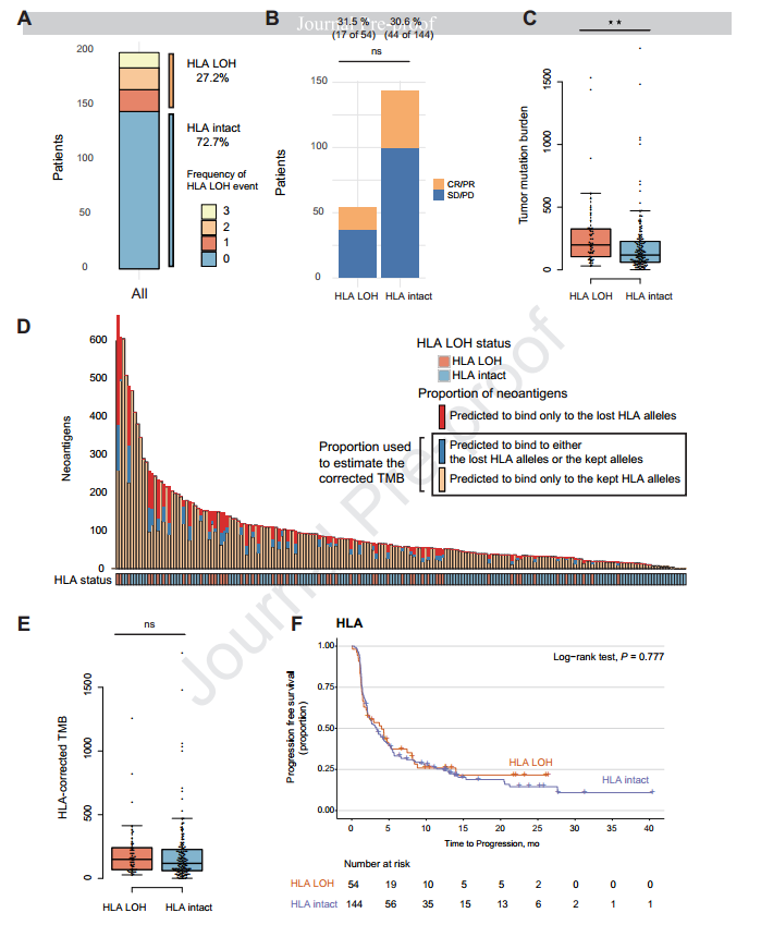 在198位非小细胞肺癌患者中,54位携带HLA-I类基因的LOH。与无HLA LOH的相比,HLA LOH的患者拥有更高的体细胞非同义突变(中位TMB 199 vs 118 mutations),与之前的研究结果一致。另外,研究发现HLA LOH与抗PD-1药物应答无关。