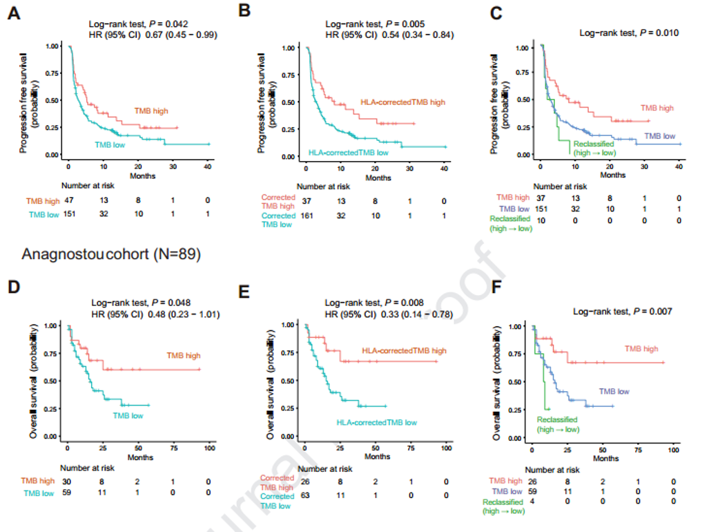 进一步发现,HLA校正的TMB相对于传统方法计算的TMB,具有更好的预测价值。在多变量分析中,HLA校正的TMB对PFS和OS显示出很好的预测价值(HLA校正的TMB高,PFS HR =0.45 P=0.004、OS HR=0.44 P=0.015),而传统方法计算的TMB与OS无显著相关性。