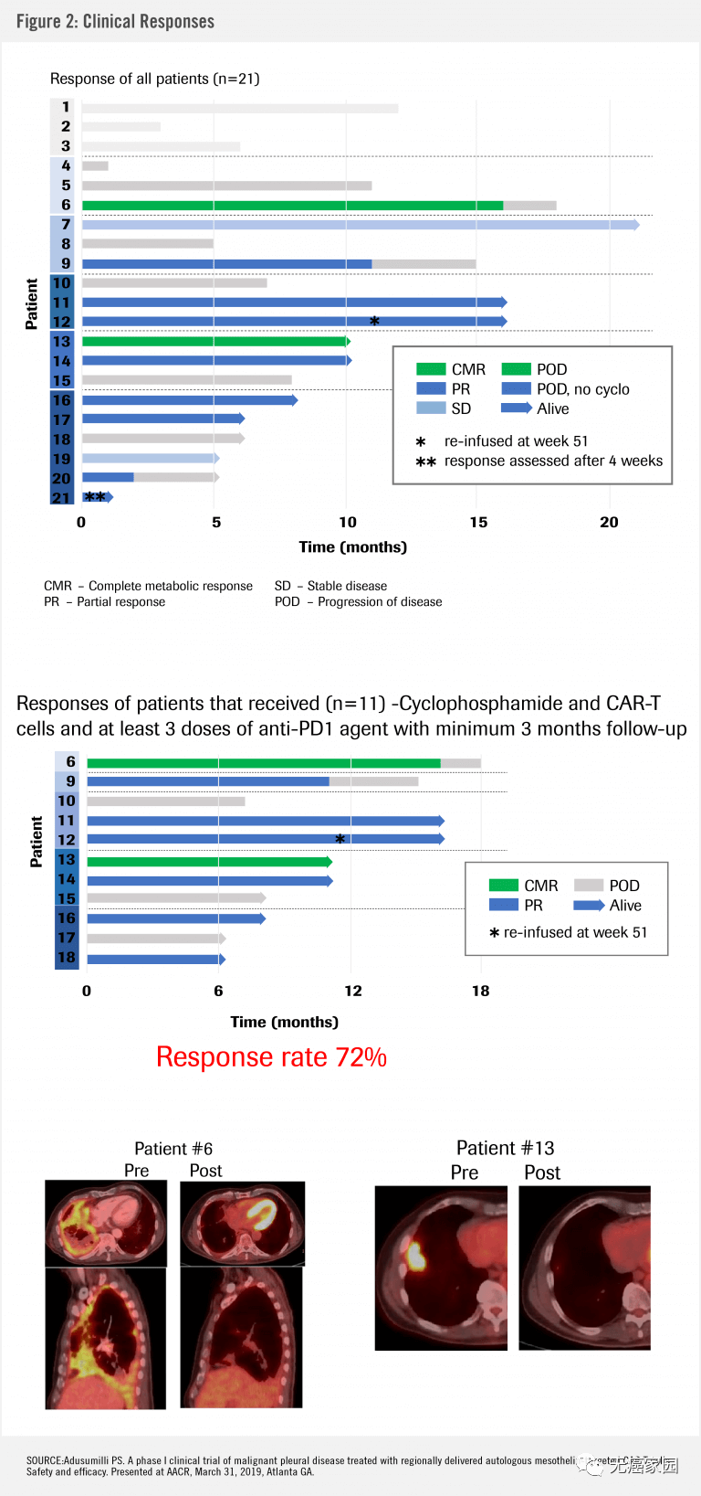 接受治疗38周后,21例患者中有13例的外周血中依然可以检测到持续存在的CAR-T细胞。有11例患者顺利完成CAR-T注射及至少3个疗程的PD-1治疗。经过至少3个月的随访,11例患者中,有8例患者肿瘤明显缩小,甚至包括2例患者PET-CT提示肿瘤完全消失,总体缓解率高达72%。