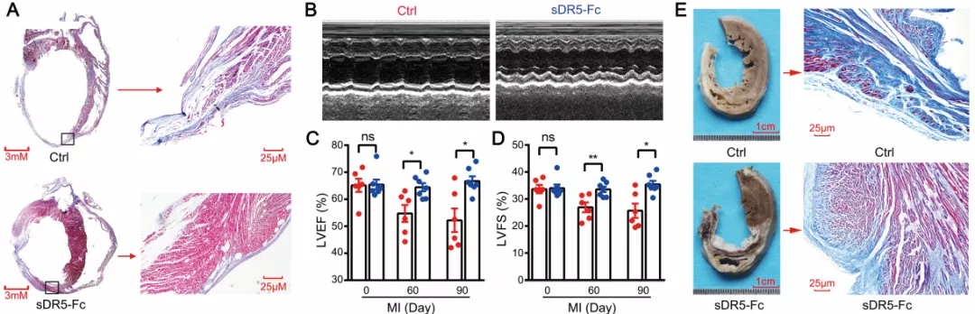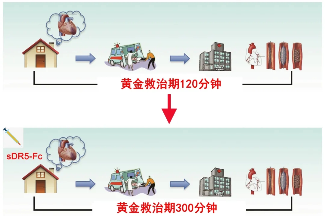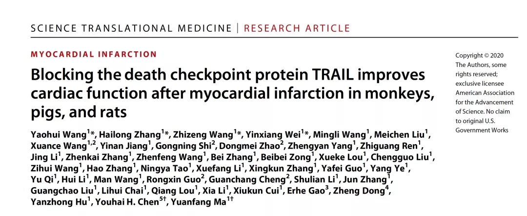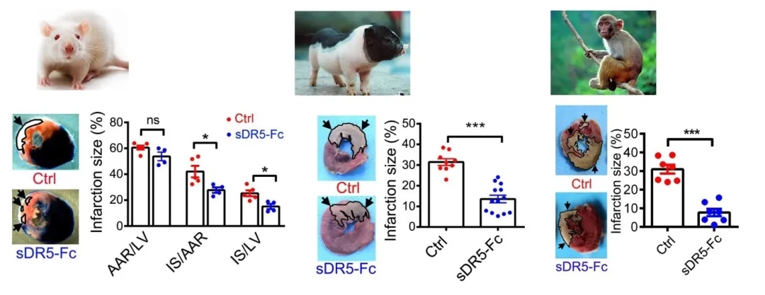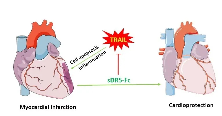 当前,缺血性心脏病是世界范围内导致人口死亡的首要原因,其中急性心肌梗死(Acute myocardial infarction, AMI)是关键致死因素。在我国,随着医药卫生事业的发展,越来越多的急性心肌梗死患者接受溶栓或PCI(经皮冠状动脉介入)治疗,但仍存在两大问题亟待解决。一是时间窗口短—冠状动脉堵塞后缺血区心肌细胞以每小时20%的速度死亡,而能在120分钟的黄金救治期内完成PCI手术的病人少之又少,均因各种原因被耽搁。二是再灌注损伤—即使血管开通,也会引起“二次伤害”—心肌缺血再灌注损伤,在一定程度上加剧心肌损伤,后期很多病人发展为心力衰竭。针对上述两大问题,河南大学抗体药物开发技术国家地方联合工程实验室马远方教授团队经过十余年潜心研究,研发出一种新型抗体融合蛋白—sDR5-Fc,通过阻断肿瘤坏死因子相关凋亡诱导配体(TRAIL)发挥心脏保护作用。4月22日,相关成果以“Blocking the death checkpoint protein TRAIL improves cardiac function after myocardial infarction in monkeys, pigs, and rats ”为题,在Science Translational Medicine杂志在线发表。