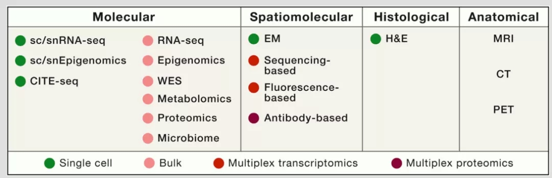 大多数人类肿瘤图谱网络都采取了双管齐下的方法建立肿瘤图谱,一方面是通过分离的标本中收集单细胞的转录组、蛋白质组、全基因组染色质可及性或者甲基化的特征分析,另外一方面对组织中的RNA或者蛋白质进行空间分辨的多组分结合分析方法,同时在形态学和解剖学的方面利用高分辨率显微镜以及核磁共振等方式加入更多维度的信息(图4)。