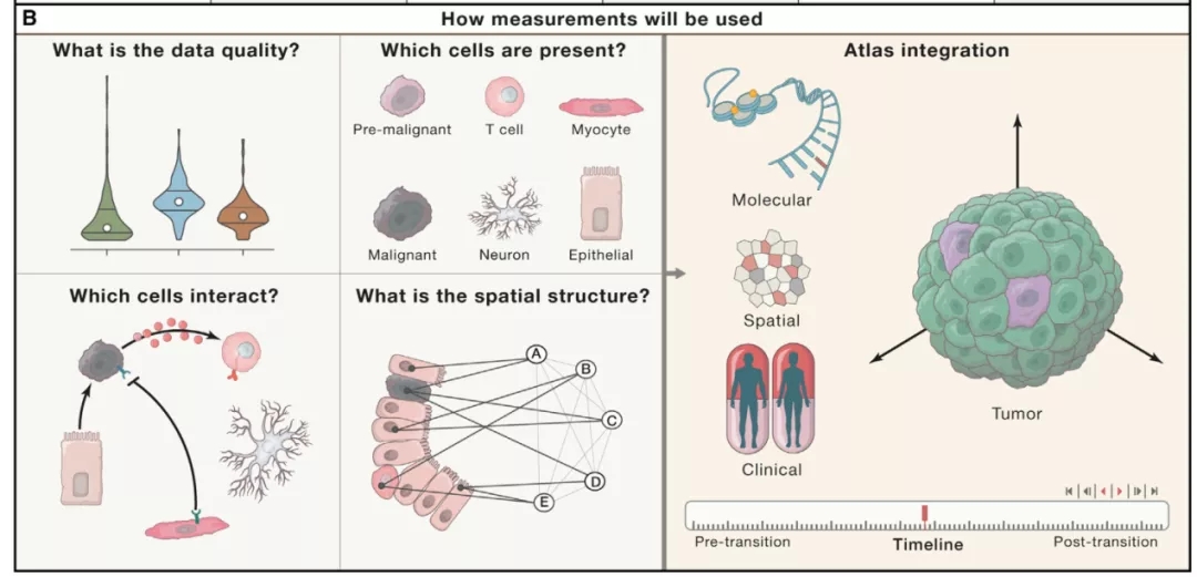 作为癌症登月计划的一部分,人类肿瘤图谱网络产生的数据将为我们对癌症生物学的理解产生深远的影响,并有可能提高癌症的检测、预防和治疗发现,为癌症患者和那些有癌症风险的人提供更好的精确药物治疗。人类肿瘤图谱网络将发展多种癌症变化过程的3D图谱,类似于Google Maps一样易于查找和使用。癌症的转变过程将跨越肿瘤的发展,包括前恶性肿瘤到恶性肿瘤、原发肿瘤到肿瘤转移、从治疗前到治疗后的反应等等(图1)。希望能够对肿瘤发展过程中不同时间点的肿瘤结构、细胞组成以及多维度的相互作用进行解析,帮助鉴定新颖的肿瘤细胞标记物以及找到新的治疗方法。