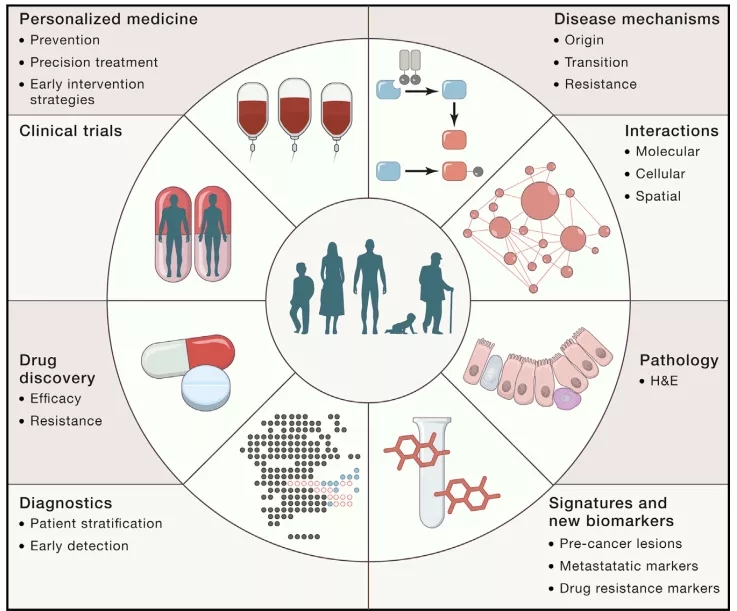 首先,肿瘤微环境及其组成细胞间的相互作用为治疗提供了方向【1】;其次,尽管以前的研究大多集中在治疗和预后数据有限的原发性肿瘤上,人类肿瘤图谱网络强调纵向采样,包括癌症发生之前、晚期肿瘤、转移和治疗反应,同时收集全面的临床数据;第三,空间方法的整合将有助于将癌症基因组学和组织病理学联系起来,这是诊断癌症和提供治疗信息的两种主要手段。这些将共同为检测、预防和治疗策略提供信息【2】。