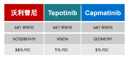 有基因就可能有相应的靶向药物,目前MET通路主要有三驾马车:沃利替尼、Capmatinib和Tepotinib,但非常遗憾的是,在三个MET抑制剂中,只有中国自主研发的MET抑制剂沃利替尼纳入了高达36%的肺肉瘤患者,目前我们只能从这个研究中看MET抑制剂对PSC的疗效。