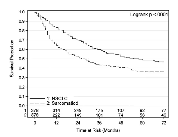 而从下图我们可以看到,和其他类型的非小细胞患者相比,肺肉瘤样癌(PSC)的预后更差,生存期更短。