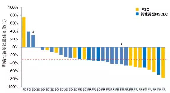 在这个2019年AACR上报告的沃利替尼治疗MET exon14的肺癌研究中发现:11名PSC患者中,6例PR,4例SD,1例PD,疗效确切。