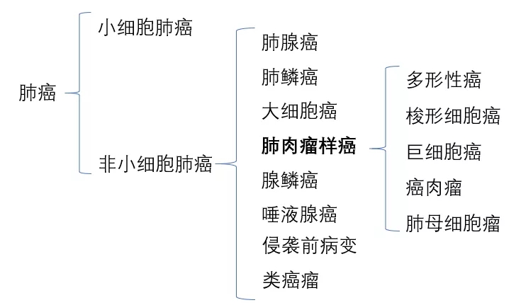 PSC,按照病理划分,可归属于非小细胞肺癌。PSC往下又可以细分为多形性癌、梭形细胞癌、巨细胞癌、癌肉瘤、肺母细胞瘤。