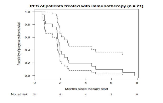 临床研究也发现相似的结果,24例患者接受免疫治疗,仅4例患者取得部分缓解,客观缓解率为17%,中位PFS仅为1.9个月。