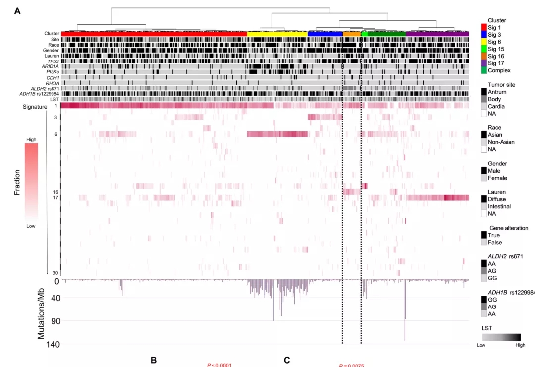 研究小组对这些数据进行比较和分析,并根据组织样本的突变特征,将他们划分为6组,其中有一组Signature 16与一种饮酒相关突变——ALDH2有关。在这个特殊的组中,90%以上的患者为亚洲人,并且70%的患者携带ALDH2突变。