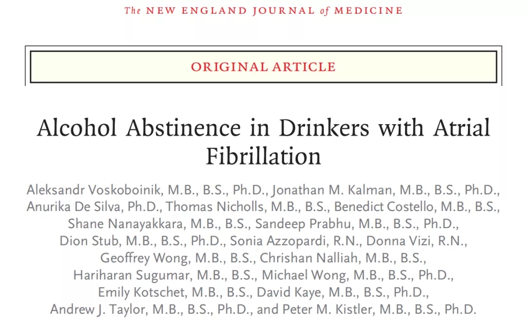 2020年1月2日,国际顶尖医学期刊 NEJM 上发表了了一篇题为:Alcohol Abstinence in Drinkers with Atrial Fibrillation 的研究论文。该研究指出戒酒可有效减少常饮酒且患心房颤动者心律失常的复发。