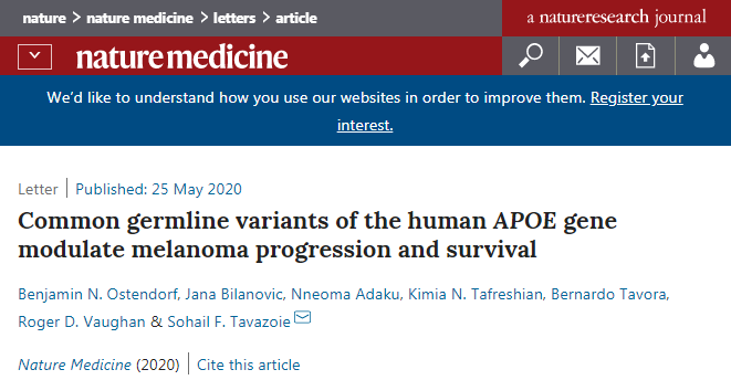 【2】Ostendorf, B.N., Bilanovic, J., Adaku, N. et al. Common germline variants of the human APOE gene modulate melanoma progression and survival. Nat Med (2020). https://doi.org/10.1038/s41591-020-0879-3