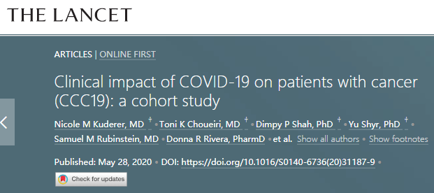 2020年5月28日,Nicole M Kuderer等人在国际顶级医学期刊Lancet 在线发表题为“Clinical impact of COVID-19 on patients with cancer (CCC19): a cohort study”的研究论文,该研究收集了来自美国,加拿大和西班牙的18岁及以上已确诊为SARS-CoV-2的活跃或先前恶性肿瘤患者的数据。主要终点是诊断COVID-19的30天内的全因死亡率。