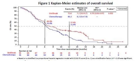 研究共纳入190例患者,按1∶1的比例随机分配入信迪利单抗组(200mg,q3w)和化疗组(紫杉醇175mg/m2,Q3W,或伊立替康180mg/m2,q2w),信迪利单抗组的中位总生存(OS)相比紫杉醇/伊立替康化疗组更长,可以显著延长患者总生存期(HR=0.70, P=0.032),信迪利单抗组和化疗组的中位OS分别为7.2个月和6.2个月,12个月OS率分别为37.4%和21.4%,信迪利单抗显示出了令人鼓舞的抗肿瘤疗效。信迪利单抗在食管鳞癌中的安全性特征与其他瘤种相似。