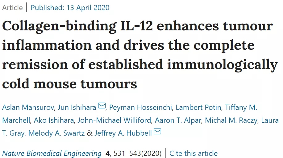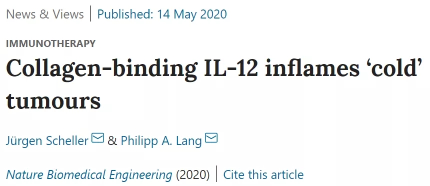 5月14日,来自德国杜塞尔多夫大学医学院的两位专家在 Nature Biomedical Engineering 上发表文章探讨了芝加哥大学Jeffrey Hubbell等人之前的一项研究,即静脉注射能与小鼠“冷”肿瘤(肿瘤浸润T细胞密度低的肿瘤)中胶原蛋白结合的经过修饰的IL-12制剂,可在降低免疫相关副作用的同时有效清除“冷”肿瘤,特别是与免疫检查点阻断疗法结合使用时 [1]。