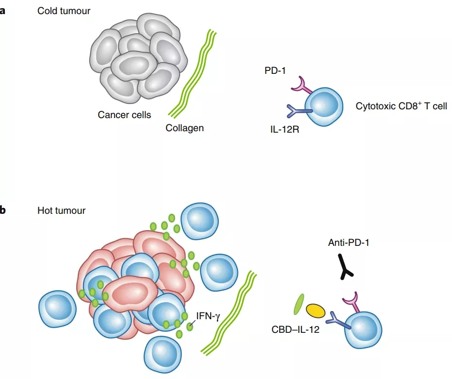 CBD−IL-12增强冷肿瘤的免疫原性。a)冷肿瘤的浸润免疫细胞数少。这可能是细胞毒性CD8+T细胞活化不良或耗竭的结果,可能涉及免疫抑制PD-L1/PD-1通路。IL-12R = IL-12受体。b)当免疫检查点阻断释放抑制免疫反应时(如使用抗PD-1抗体),肿瘤中以暴露的胶原蛋白为靶点的CBD–IL-12产生的IL-12信号导致细胞毒性CD8+T细胞的激活和增殖。肿瘤浸润细胞毒性CD8+T细胞释放IFN-γ等免疫介质。(图片来源:Nature Biomedical Engineering [1])