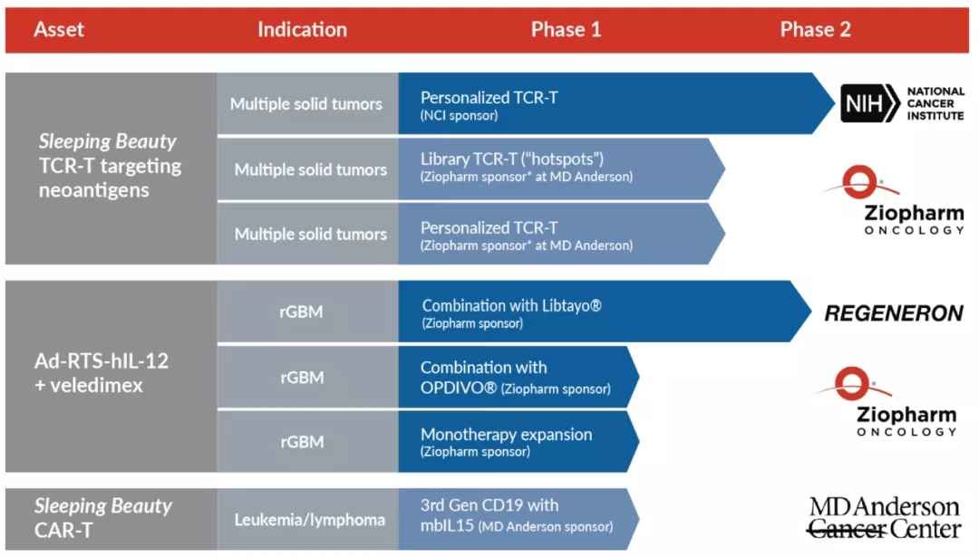 Ziopharm Oncology的研发管线共三个,基于睡美人的TCR-T疗法,用于治疗多种实体肿瘤;基于睡美人的CAR-T疗法,用于治疗白血病和淋巴瘤,以及本文介绍的基于腺病毒载体的受控IL-12疗法,用于治疗胶质母细胞瘤,目前这些疗法均处于1期和2期临床试验阶段。