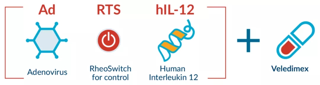 针对这一思路,Ziopharm公司开发的这款疗法,在患者在进行手术清除脑瘤之前接受veledimex药物治疗,在手术期间,将携带IL-12基因的腺病毒直接注射到肿瘤中。veledimex能够打开和关闭IL-12的表达,并对其进行表达水平的调节。