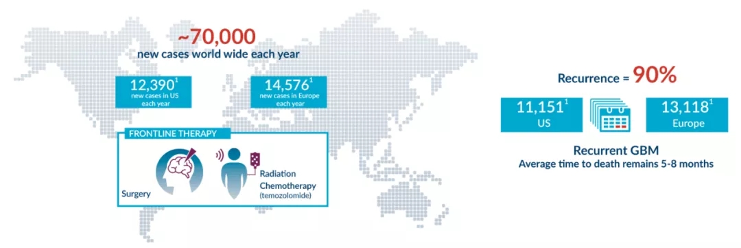 胶质母细胞瘤(GBM)是成年人中最常见的脑肿瘤,全世界每年新增约70000名患者,胶质母细胞瘤很难治疗,因为它是异质性肿瘤,不是一种恶性细胞,实际上是一群具有与疾病的遗传学有关的不同属性的细胞。目前主要的治疗方式是手术治疗和放疗、化疗,然而,胶质母细胞瘤治疗后复发率高达90%,复发性胶质母细胞瘤患者的平均生存时间仅5-8个月。