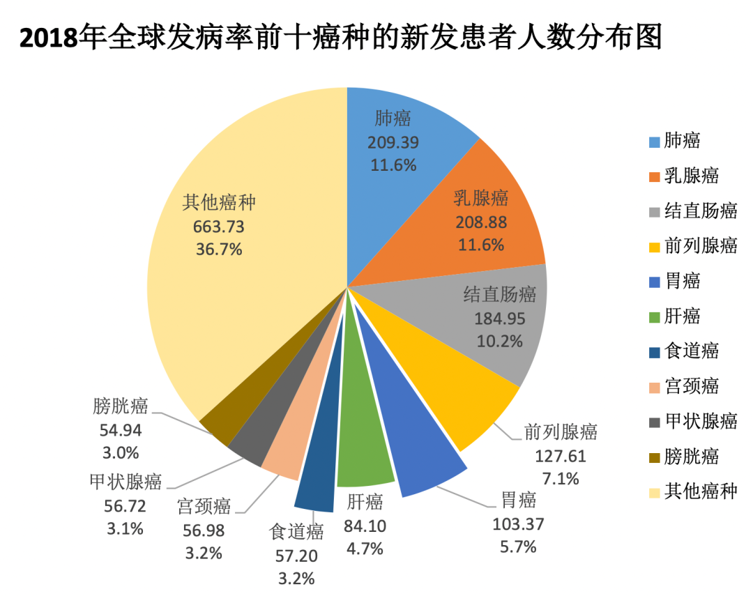 图1 2018年全球发病率前十癌种的新发患者人数分布图 (单位:万人)