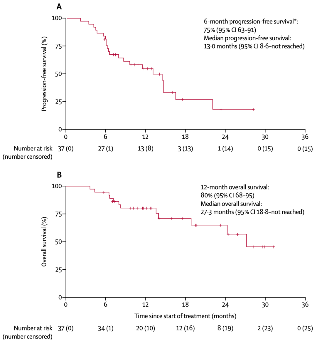 在2019年8月6日数据截止时,中位随访时间为13.0个月。研究达到其主要终点,在37位患者中有26位(70%)6个月内疾病无进展(Kaplan-Meier估计的6个月无进展生存率为75%),中位无进展生存期为13.0个月,中位总生存期为27.3个月,而12个月总生存率为80%。