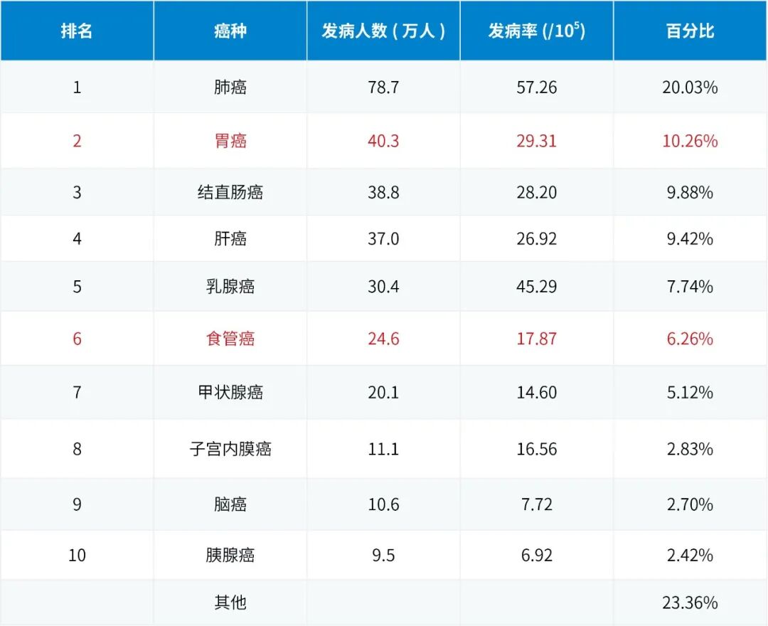 在2018年,全球食管胃癌(胃癌,食管癌或胃食管交界处癌)新诊断患者有160多万,是世界上第四大癌种,也是癌症相关死亡的第三大原因。根据中国最新统计数据显示,2015年中国新发胃癌和食管癌共计64.9万人,在所有新发癌种患者中分别排名第2和第6,这两种癌症每年的死亡人数在48万左右。食管胃癌有一定的地域分布特点,可能跟饮食结构相关,中国人群相对于西方人群患病率更高,多发于40岁以上,男性患病率明显高于女性。