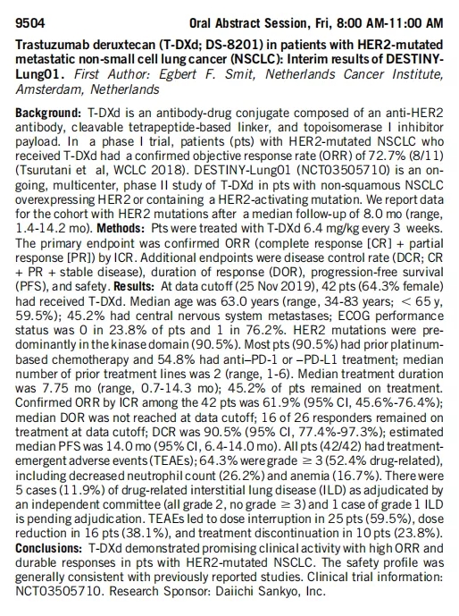 本次ASCO将公布DS-8201在肺癌的DESTINY-Lung01的中期分析结果。截至2019.11.25,共纳入了42例HER2激活突变的晚期NSCLC患者,其中45.2%具有脑转移。患者的既往中位治疗线数为2,90.5%患者既往接受过含铂双药化疗,54.8%患者接受过免疫治疗。中位治疗持续时间为7.75个月。经ICR(独立中心评审)确认的ORR为61.9%,中位DOR未达到,DCR为90.5%,预估的中位PFS为14个月。这是目前肺癌HER2突变方面疗效最高的药物,数据一旦成熟,有望成为HER2突变肺癌的标准用药!未来可期。