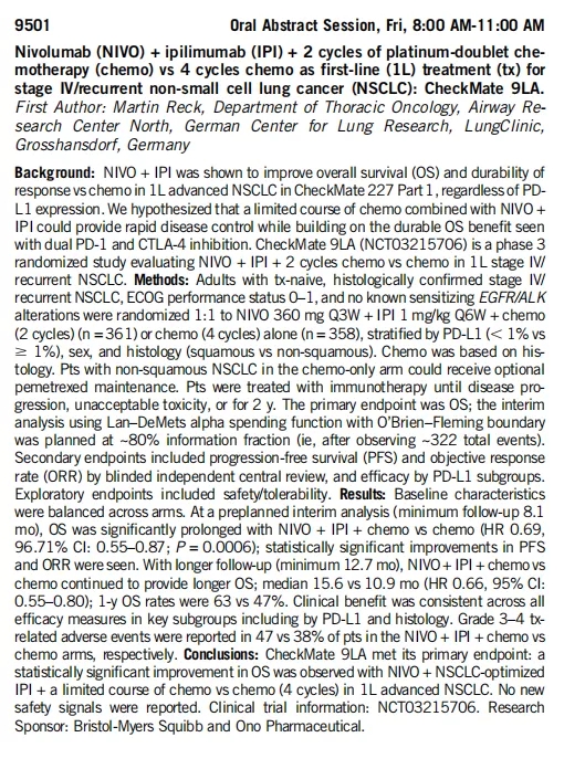 (2)CheckMate9LA III期研究中纳入初治的EGFR/ALK阴性晚期NSCLC患者,使用O药360mg(q3w)+伊匹1mg/kg(q6w)+化疗(2周期)或单纯4周期化疗治疗。
