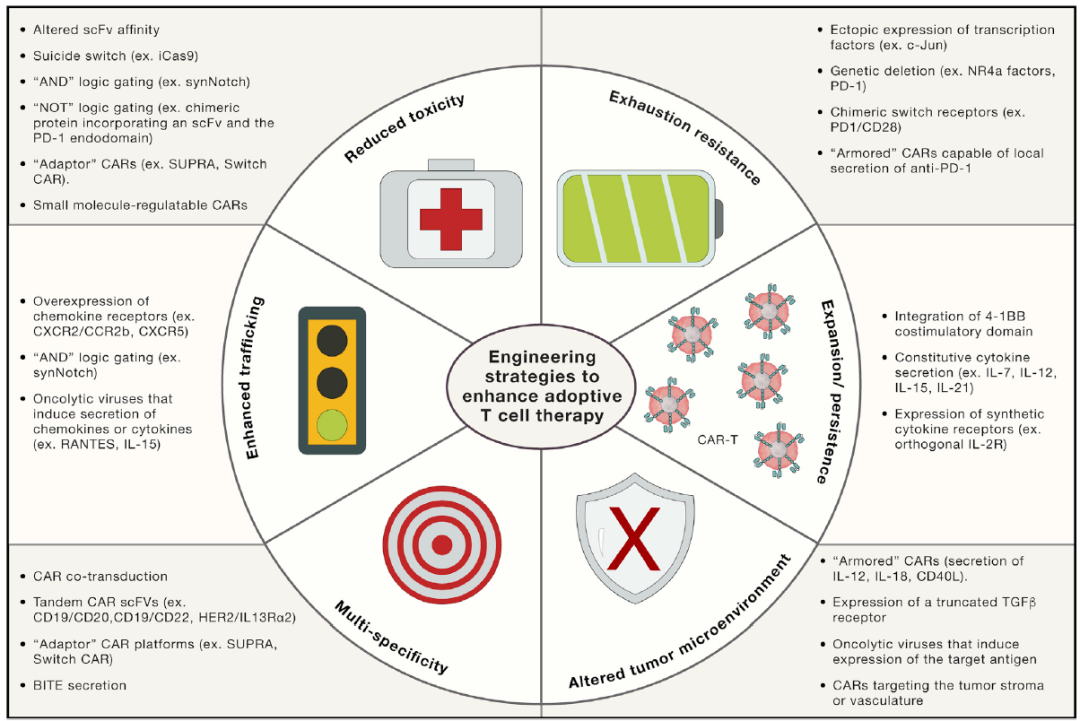 开发自杀开关,AND门控和适配器CAR平台以减轻CAR介导的毒性。c-Jun的异位表达或NR4a因子的基因缺失使CAR T细胞具有精疲力竭性,可能会改善实体瘤的疗效并增强持久性。