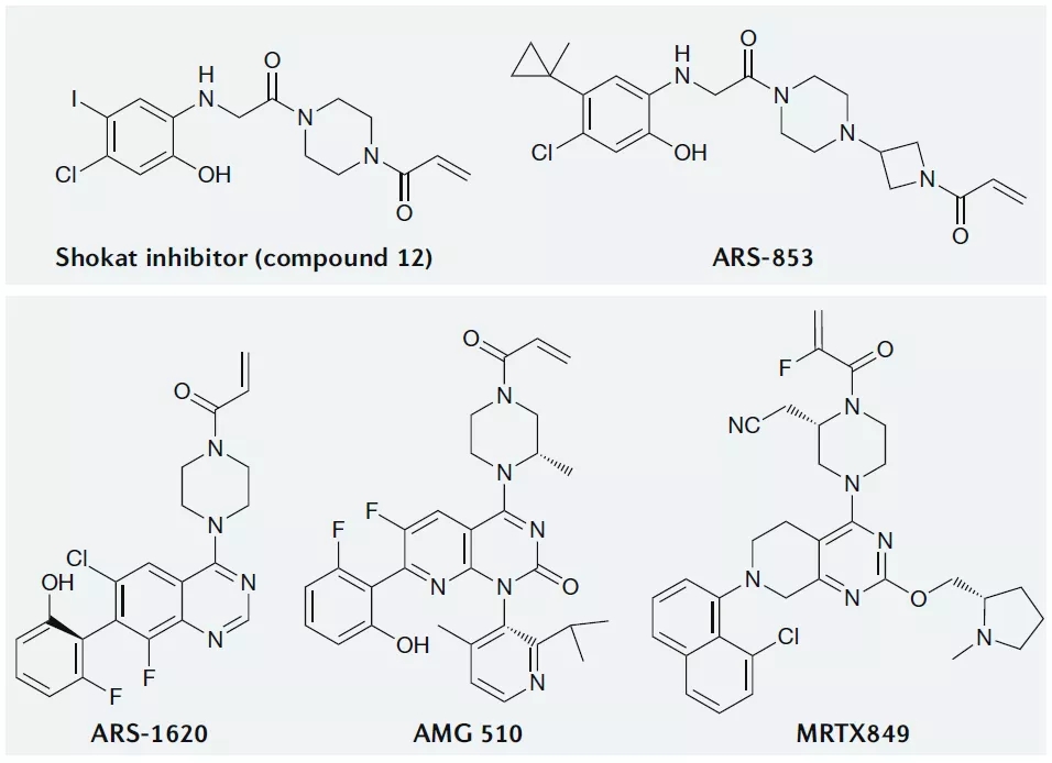KRAS中G12是突变热点,而G12C是该位置的第三大最常见突变,共价靶向活性位点半胱氨酸是药物发现中广泛使用的策略,KRAS-G12C的半胱氨酸可以被用来开发共价小分子抑制剂,重要的是,野生型KRAS在活性位点缺乏半胱氨酸,因此可以通过这种方法特异性抑制KRAS-G12C。