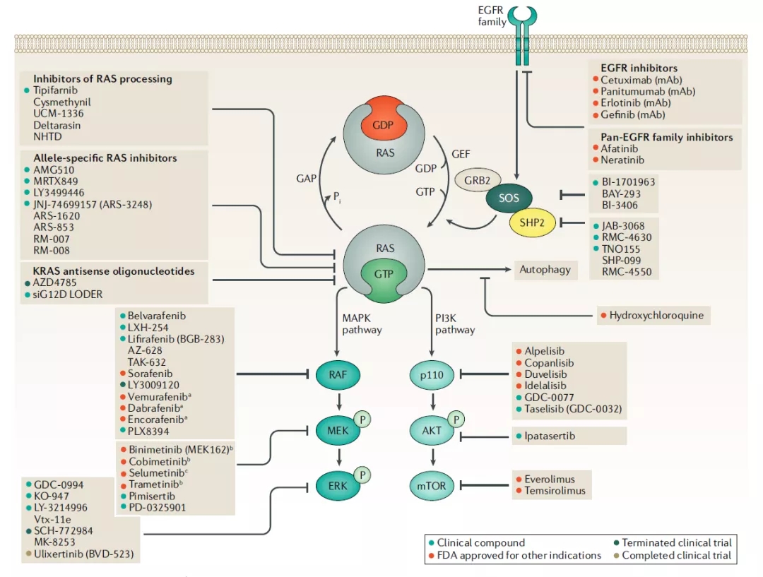有两种靶向RAS通路的不同方法:鉴定具有RAS突变致死性的基因,靶向酪氨酸激酶受体(EGFR家族)或RAS效应子通路,即MAPK和PI3K。
