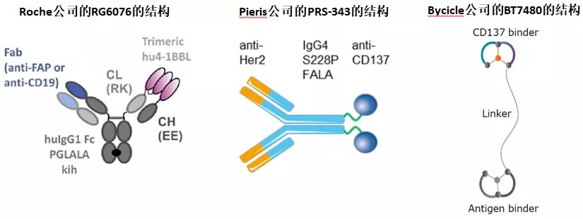 对于靶向4-1BB/TAA的药物分子类型,各公司尝试设计了多种分子类型和结构。分子的整体结构有融合蛋白,也有合成多肽;融合蛋白中有双特异性抗体,也有抗体与4-1BBL的融合蛋白。