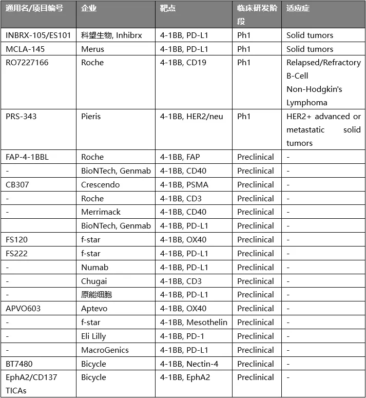 因此, 4-1BB靶向性药物开发的核心问题是如何合适地调控4-1BB的活性。针对urelumab,开发者的调整策略是降低剂量,并与其他药物联用;而utomilumab活性较低,必须尝试联用。而另外一种主流策略就是开发双特异性的药物(包括抗体和其他类型的分子)。小编能够检索的相关项目如下,包括临床阶段和临床前阶段的项目,可以一窥整体的开发思路。