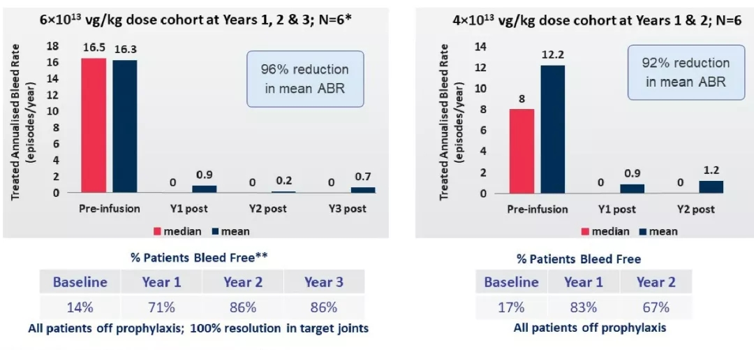 去年(2019年7月),BioMarin在ISTH上公布了ValRox的I/II期临床研究结果。根据公告,这项代号BMN270-201的I/II期临床研究包含了6e13 vg/kg和4e13 vg/kg两组研究数据。数据显示6e13 vg/kg组6位患者治疗三年后的平均ABR从入组前的16.3降至0.7,降幅达96%,中位ABR从入组前的16.5降至0,86%的患者未发生出血事件,同时所有的患者都不需要进行预防治疗。4e13 vg/kg组6位患者2年数据表现出略差于6e13 vg/kg组的结果,治疗两年后平均ABR从入组前的12.2降至1.2,降幅92%,中位ABR从入组前的8降至0,67%的患者未发生出血事件,两组患者都不需要预防治疗。