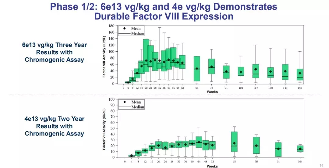 根据Biomarin,6e13vg/kg组4年更新数据和4e13 vg/kg组的3年更新数据显示,两组患者在接受单剂量ValRox治疗后不需要预防性因子VIII治疗。此外,两组患者中,累积平均年化出血率(ABR)均低于1,并且低于治疗前的基线水平。6e13 vg/kg组第4年的平均ABR为1.3,而4e13 vg/kg组第3年的平均ABR为0.5。过去的一年中,6e13vg/kg组7名参与者中的6人,4e13 vg/kg组6名参与者中的5人没有发生自发性出血。使用ValRox治疗后,因子VIII活性水平的下降情况与之前所观察到的一致,并保持在一个可以提供止血效果的范围内。