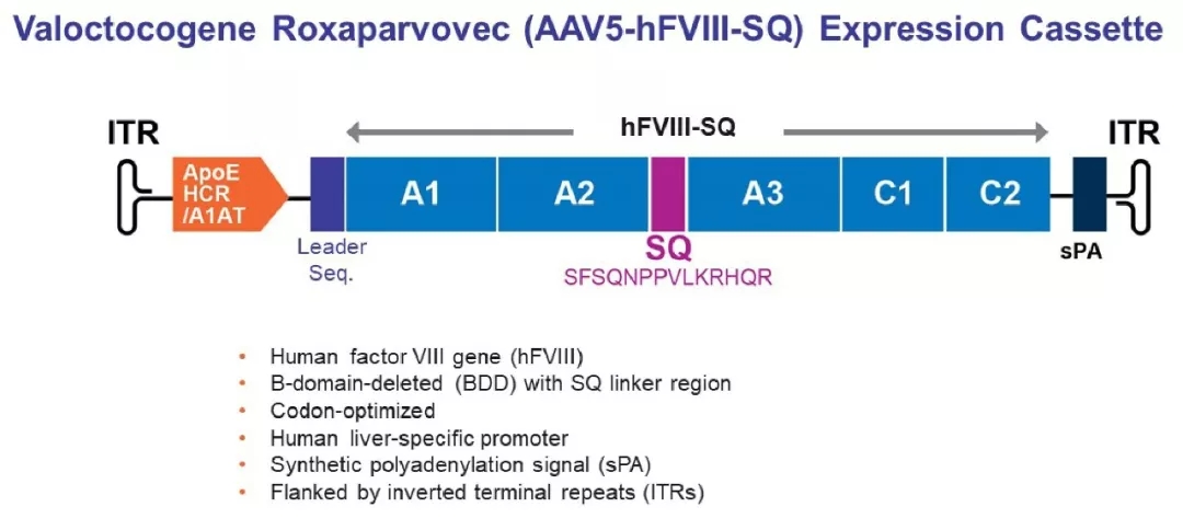 ValRox采用AAV5载体,为满足AAV5的装配要求,BioMarin删除B结构域,使FⅧ基因由7kbp减少至约4.4 kbp,A2和A3结构域通过SQ序列进行连接。删除B结构域的因子VIII可保留活性,目前已有多个删除B结构域的重组因子VIII上市(如NUWIQ、ReFacto和XYNTHA)。BioMarin还对因子VIII基因还进行了密码子优化,设计了末端反向重复序列(ITRs)、人体肝脏细胞特异性的启动子以及sPA。